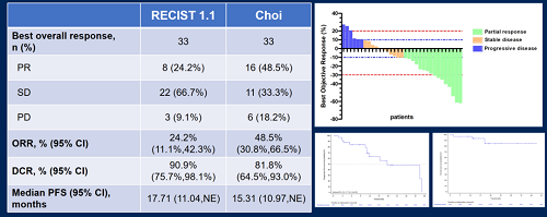 结果显示,根据RECIST 1.1标准,8例患者(24.2%,[95% CI:11.1%,42.3%])达到部分缓解(PR),22例患者(66.7%)达到疾病稳定(SD),疾病控制率(DCR)达到90.9%(95% CI:75.7%,98.1%),中位PFS为17.71个月(95% CI:11.04,NE)。根据Choi标准,16例患者(48.5%,[95% CI:30.8%,66.5%])达到PR,11例患者(33.3%)为SD,DCR为81.8%(95% CI:64.5%,93.0%),中位PFS为15.31个月(95% CI:10.97,NE)。安全性方面,整体可控。