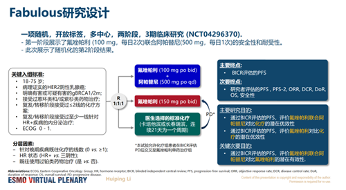 本研究纳入203例gBRCA1/2突变HER2-晚期乳腺癌受试者,在晚期治疗阶段,允许受试者既往接受≤2线化疗,HR+受试者允许接受至少1线内分泌治疗。满足入排条件受试者随机分配接受氟唑帕利(100mg,bid)联合阿帕替尼(500mg,qd)、氟唑帕利单药(150mg,bid)、医生选择标准化疗治疗(卡培他滨或长春瑞滨),医生选择治疗组患者进展后允许交叉至氟唑帕利单药组继续治疗。